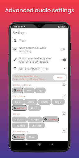 The voice recorder has advanced settings for sound recording quality as well as recording formats including WAV and M4A. There’s also channel selection, so you can also record stereo sound. When you first start the application, you will be shown the current sound quality settings that you can change, followed by all the explanations of how the changes will affect the file size or sound quality.