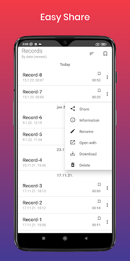 Rename all your files, share them with others, or open in other applications. There is also the option to export the file to the public memory of the device to access it with a home computer. Voice recorder will calculate how much time you have left to record based on the quality settings and free memory on the device.