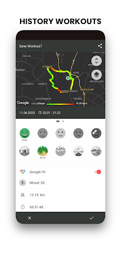 Stay in shape and track your outdoor activities with this app. Get information on average speed, calories burned, steps (pedometer), heart rate and much more information while running, cycling, hiking and other sports and fitness activities.