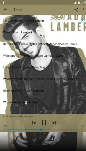 Adam Lambert Free Album Offline is a completely FREE online music application. The purpose of this Adam Lambert Free Album Offline application is to provide users with the best features and the easiest to use. Our application aggregates the most popular songs online, ... so you can search for the songs you like to listen to.