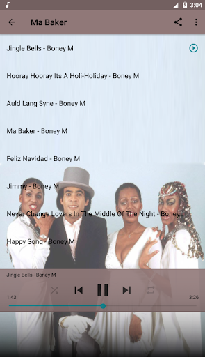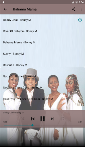 Boney M Top Music Hot is a fun application to help you listen to offline music without the Internet. In addition, Boney M Top Music Hot is also a collection of Boney Ms music albums. The high quality MP3 songs performed by Boney M are selected by us and put into Boney M Top Music Hot application. This is the best and most complete Offline music app for Boney M's lifetime albums we've compiled.