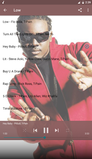 T-Pain Music Of Album is a completely FREE online music application. The purpose of this T-Pain Music Of Album application is to provide users with the best features and the easiest to use. Our application aggregates the most popular songs online, ... so you can search for the songs you like to listen to.