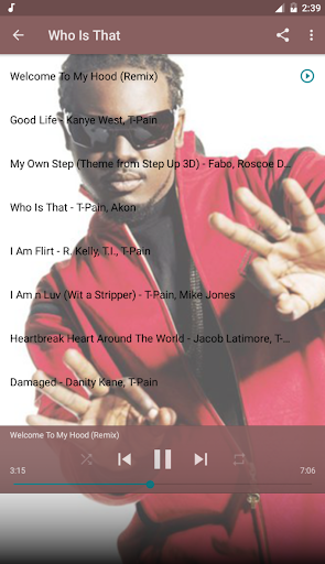 T-Pain Music Of Album is a fun application to help you listen to offline music without the Internet. In addition, T-Pain Music Of Album is also a collection of T-Pain music albums. The high quality MP3 songs performed by T-Pain are selected by us and put into T-Pain Music Of Album application. This is the best and most complete Offline music app for T-Pain's lifetime albums we've compiled.