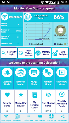 - Six study Modes (learning mode, handout mode, test mode with MCQs, slideshow mode, random mode & Game Memory mode)