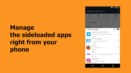 With Sideloader for Fire TV app, you can install any apps that you want to Amazon Fire TV or Stick, launch and manage them right from your phone or tablet.