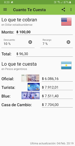 มีตัวแปลงเหรียญจำนวนมาก แต่ส่วนใหญ่ไม่ได้ให้บริการที่จะรู้ว่ามีค่าใช้จ่ายเท่าใดกับอาร์เจนตินาในการซื้ออะไรในต่างประเทศเนื่องจากค่าใช้จ่ายขึ้นอยู่กับวิธีการชำระเงิน (เงินสด / บัตร ) และอัตราแลกเปลี่ยนที่ใช้สำหรับการทำธุรกรรม (ทางการแลกเปลี่ยนบ้านสีน้ำเงิน ฯลฯ )