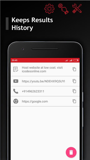 Al the scanned result will be stored into local database for future use. History will be visible into a simple list. User can copy result to clipboard to user somewhere else. App can detect web URL intelligently. If web URL found as a scanned result, it will be redirected to web browser directly.