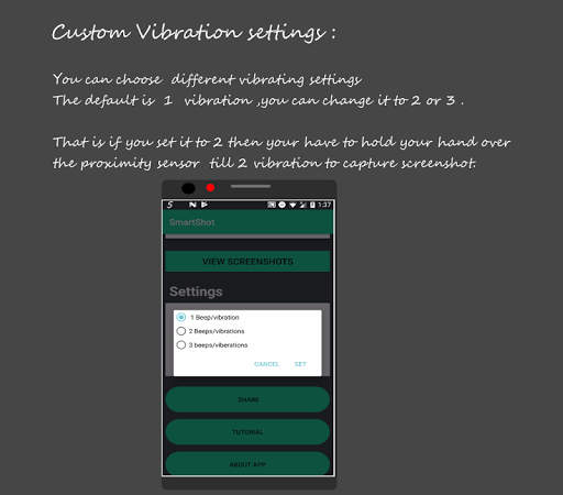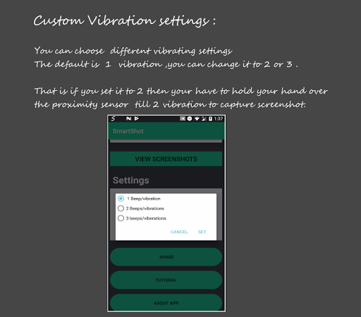 By default the app captures the screenshot after one beep/vibration but you can easily change this