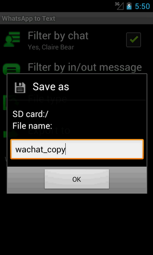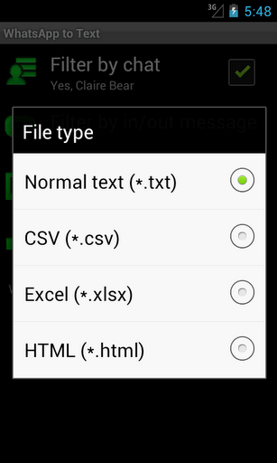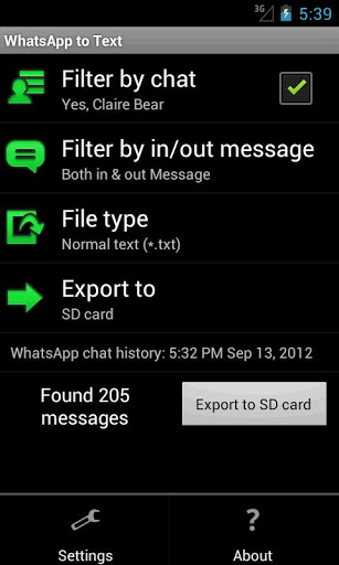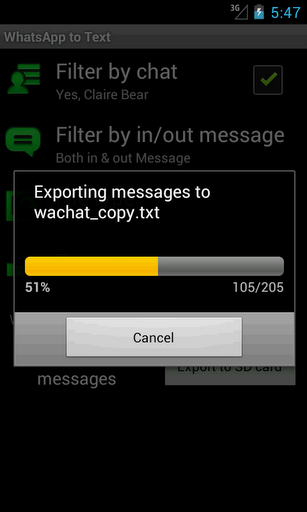WhatsApp to Text allows you to export your WhatsApp messages to Plain Text, CSV, Excel and HTML file formats and yes, those files can be read in your phone or computer Your exported files can be saved on your phone39;s SD card or sent to your email as attachment. It is fast and easy to backup your WhatsApp messages Features: Support Emoji characters in text format and can be displayed in Emoji supported OS Windows 7 Mac OS X 10 7 or later Export your messages and Emoji icons completely in HTML format Export and send to your email as attachment directly Filter by chat Filter by message type Sorting messages Export to Normal plain text .txt Export to CSV, commaseparated values .csv Export to Excel 20072010 workbook .xlsx Export to HTML web page .html Selectable date and time format Support Unicode UTF8 encoding withwithout BOM Support Windows, Unix, Mac plain text new line format Sample Output screenshots can be found on our Facebook page WhatsApp to Text and SMS to Text share same file format, those exported WhatsApp messages can be restored to your phone as SMS using SMS to Text Tips:WhatsApp to Text exports your messages based on your WhatsApp chat history backup. Please follow the steps below to make the uptodate chat history backup:1. Open WhatsApp2. Press the Menu button3. Click quot;Settingsquot;4. Click quot;Chat preferencesquot;5. Click quot;Chat history backupquot; We improve WhatsApp to Text continually according to users feedback, release new features and bug fix.If you need help, please don39;t comment on google play only as I can39;t reach you directly from Google Play. If you have any feedback, questions, or concerns, please contact us at:contactus@smeiti.comhttp:www.facebook.comWhatsAppToTextIf you like this app just RATE high and spread WhatsApp to Text to support us. Thanks