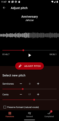 • Modify the pitch in semitones and cents of an audio track, with professional grade sound quality and formant preservation option.