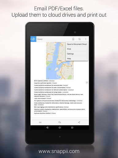 As soon as the inspection form is completed, it gets saved locally on device and there is a PDF and an Excel file generated. These files can be printed and shared via email, text message, cloud storages (DropBox, Box, Google Drive, One Drive) and other sharing options available on your mobile device.