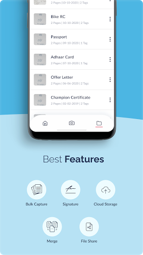 These scanned documents are saved in custom folders with pre-defined tags which can either be saved in your device or uploaded to Google Drive or other Cloud Storage.