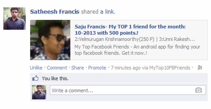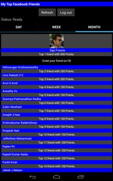 This app will monitor each of your post on Facebook and will assign points to friends based on their likes, comments, shares, photo tagging etc. You will be able to view the top 25 friends and their corresponding points through this app. Photo of the TOP 1 friend is also displayed on the app. This app provides you the facility to greet your top 1 friend on facebook wall, with details of the total points scored and names of friends at top2 and top3 positions. With this mechanism your friends will compete for the top 1 position and eventually your posts will be getting 1000+ likes, comments, shares etc....