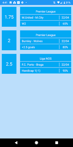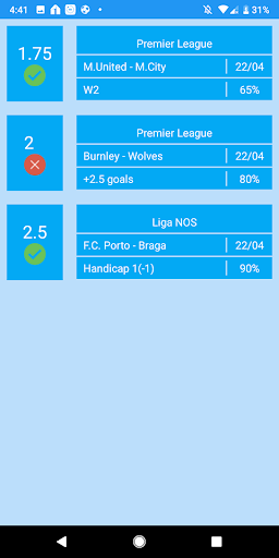 The main goal of this simple app is making you win money with great soccer tips, I'll focus on football(soccer) and try my best to analyse the matches with success, but unfortunately football isn't always predictable, red cards, bad days happen and we can only trust statistics and our gut.
