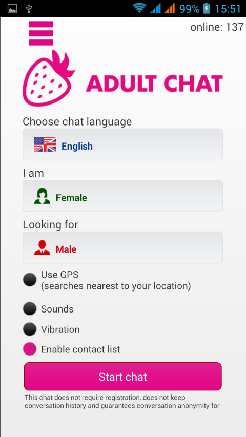 Adult Sex Chat - anonymous's free dating app! 100% Free Online Dating. Stop wasting money at dating sites. Adult Sex Chat is full of single men and women like you looking for dates, lovers, friendship, and fun. Finding them is easy with our totally free anonymous dating app Adult Sex Chat. Adult Sex Chat will allow you to find the nearest users. Join Adult Sex Chat today to dating online. Join now!
