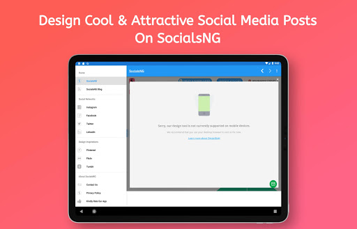 - Design and create cool ready images for your social media accounts with SocialsNG integrated design tool. No more need for a graphics designer.