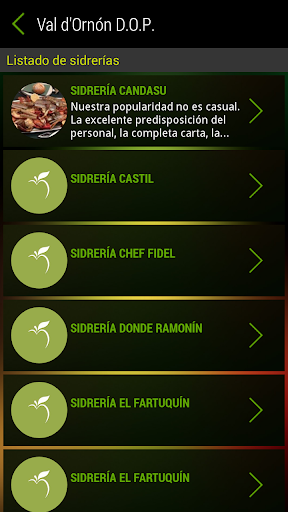 Por otro lado podemos informarnos acerca de las sidrerías y establecimientos que distribuyen cada uno de los productos que se especifican.