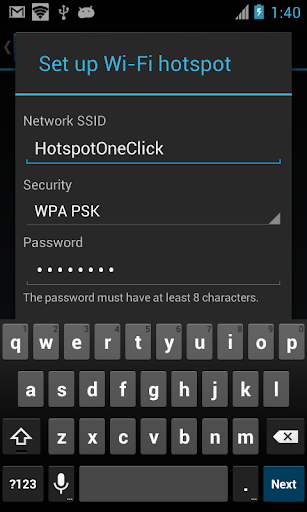 In one click you can configure your Wi-Fi hotspot and share your mobile internet on your laptop or other mobile phone. You can secure your mobile network with password and change network name.