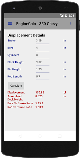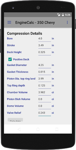 inputs include bore, stroke, deck height, gasket diameter, gasket thickness and more