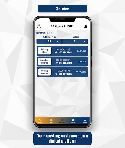 3. Solar Ginie platform extensively supports post implementation journey of the customer by helping them raise Service Requests regarding their Installed site and seeking resolution of their service reqeusts from their implementers. Solar Ginie platform also would support customers in getting quotation for Maintenance contracts from 3 implementers