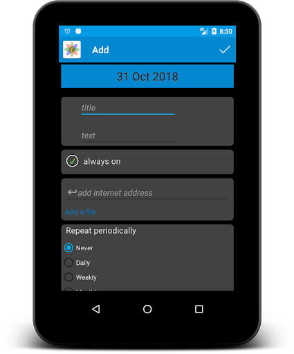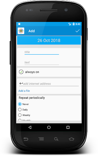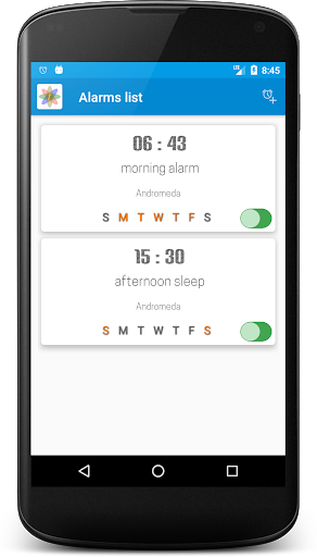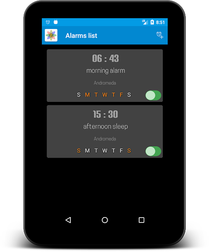 - Alarm clock function with customizable ringtone from device list or songs taken from your audio collection, other type of alerts include vibration and flash light.
