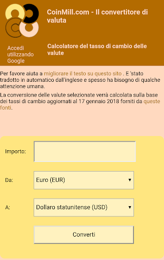 Un facile convertitore di valute, un collegamento internet con tassi di cambio aggiornati quotidianamente grazie a CoinMill.com. E' il modo più semplice per ottenere i tassi di cambio di valute che si aggiornano automaticamente. Perfetto per chi viaggia!