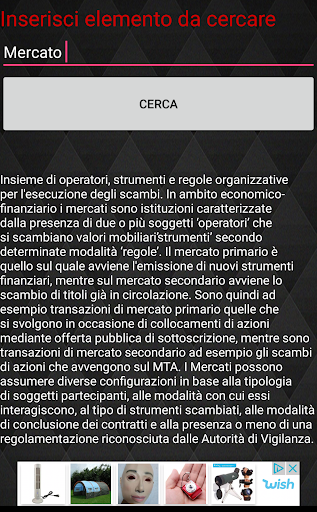 Dizionario italiano GRATUITO e offline che spiega il significato di tantissimi termini economico-finanziari, sulla base di nozioni facilmente reperibili in quanto opensource. Molto semplice da usare e subito pronta all'uso: funziona offline senza ulteriori file da scaricare! Oltre 6000 parole, utile per esigenze giornaliere e per lo studio!!