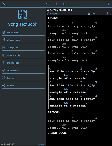 If you are looking for an app which makes it possible to manage your song lyrics and chords in a fast and easy way, also optimized for live performance, this is your app!