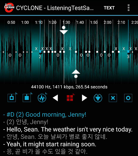 Ringdroid의 화려한 Wave form 콘트롤 파워와 FFMPEG를 활용한 문장 단위 자동 음성분절(audio segmentation)기능을 활용한 쉽고 편한 영어공부용 어학반복학습기입니다.