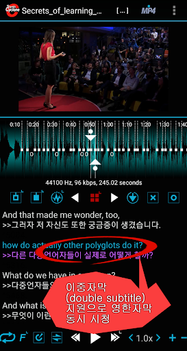 *업그레이드 된 v2.0에서는 사운드(mp3, m4a) 파일과 동영상(mp4) 파일을 지원하며 영어와 한글 자막을 동시에 볼 수 있는 이중자막을 지원합니다.