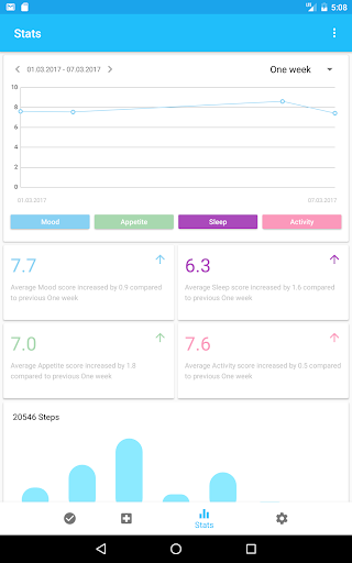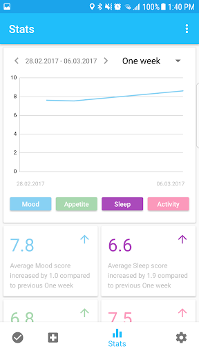 You can also log your mood, sleep quality, activity, and appetite daily, in order to monitor your treatment progress. This helps maximise the treatment effectiveness, and allows you to verify that your treatment stays on track.