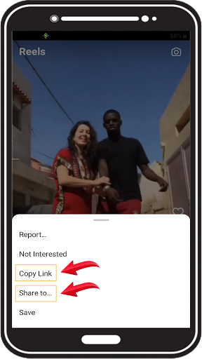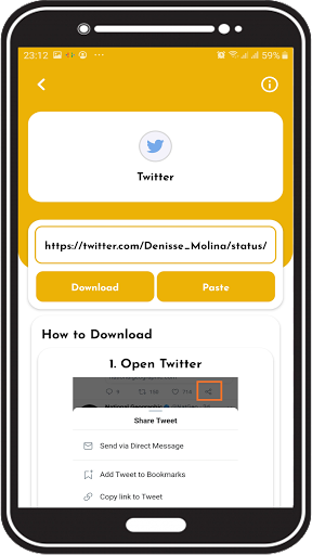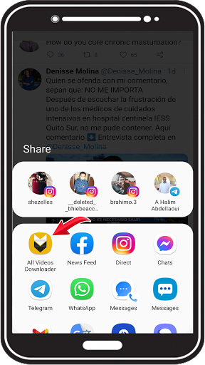 Click on the share button, all applications appear. Choose our application, directly the download interface appears, and the video link is directly present, click on the download button and enjoy the feature to save videos to your device.