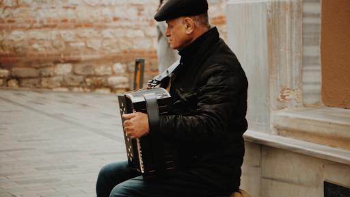 The accordion is a portable, freely vibrating reed instrument. It consists of a keyboard and bass casing that are connected by a collapsible bellows. Within the instrument are metal reeds, which create sound when air, generated by the movement of the bellows, flows around them and causes them to vibrate.