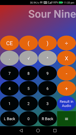This Simple Calculator provides simple mathematical functions. This application is beautifully designed with changing Background. Engine of the calculator is very powerful due to it's simplicity. This is designed by SOUR-NINE (S9) Production.