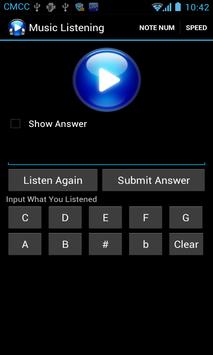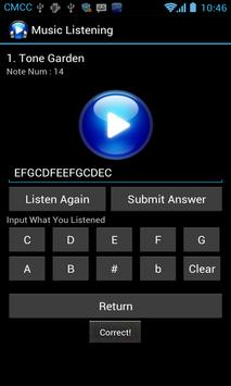 Try you music listening, this app play some notes and then you can give your answer. you can define how many notes and the play speed. it also includes a tuner.