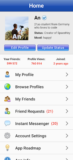 SpaceHey launched as a web-only social network in 2020 and is already home to more than 800 000 people on the web! Now, we're coming to your phone with the official SpaceHey Mobile App! SpaceHey is a safe space for you and your friends to hang out online - Join over 800 000 others already on SpaceHey, have fun, and meet new like-minded people today!