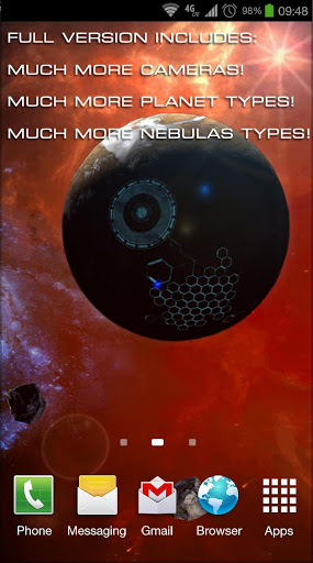 One of the most amazing Space 3D live wallpapers on Google Play for your phone or tablet! Amazing colorful fully 3d space environment includes planets, nebulas, asteroids, meteors and all you need to customize your own universe. Cinematic camera will take you to fantastic virtual tour.