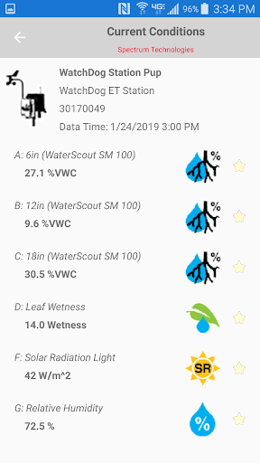 The sun/thermometer shows current conditions for the device. Also, next to each sensor is a star outline. Tapping it makes it a favorite sensor, which will be displayed on the Favorites screen.
