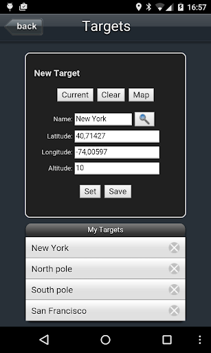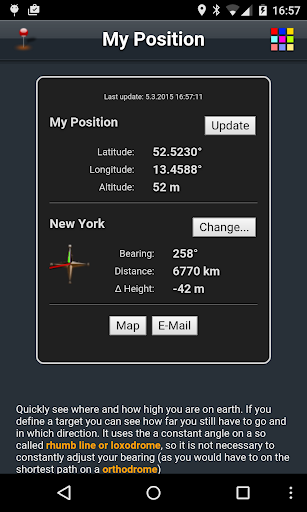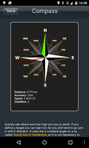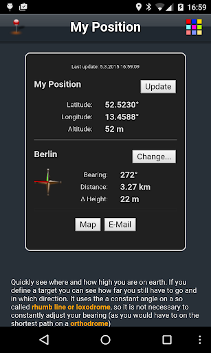 Quickly see where and how high you are on earth. If you define a target you can see how far you still have to go and in which direction. It uses the a constant angle on a so called rhumb line or loxodrome, so it is not necessary to constantly adjust your bearing (as you would have to on the shortest path on a orthodrome).