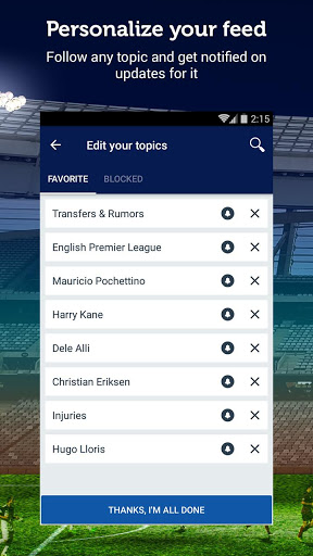 * Customized news feed - if you want to follow specific players or specific topics, like 'Transfers' - no problem. Just select the topics you want to follow and hit 'My News', or - simply block the topics you don't like!