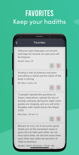 Daily Hadiths for Muslim application provides to receive hadiths as a notification, and share them with loved ones on social media and other applications. Users can share the moral behavior with friends and yourself loved ones while taking the actions and words of the Prophet Muhammad as an example. The application notify to learn the ideas and thoughts of Prophet Muhammad through the hadiths divided into categories. Users can understand how he behaves in what situation. There are no unnecessary permissions and notifications in the application.