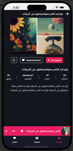Our app offers a collection of captivating audio stories, all narrated in the beautiful Arabic language. Whether you want to entertain your self during a long car ride or unwind with a relaxing story before bed, our app has something for everyone.
