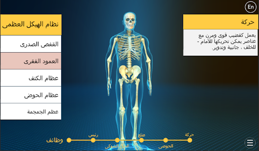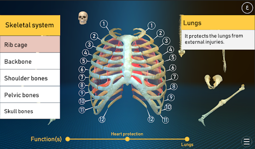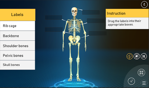 The interactive helps us to visualize the different parts of a human skeleton system. It shows how all bones protect our internal organs from external injuries, help us to move and give shape to our body.