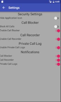 Prominent Features include Simple and easy to use Very Fast Use low memory Block calls Record calls Keep call logs password protected Notifications Can be customized according to user preferences ON/OFF settings Can be hidden from every one