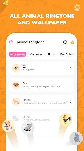 The Birds and Animals ringtones app includes a diverse range of Mammals birds water animal sounds and pet animal sounds as phone ringtones. Each animal sound is of high quality and realistic, giving you the feeling of being surrounded by these fascinating creatures with animal sound memories.