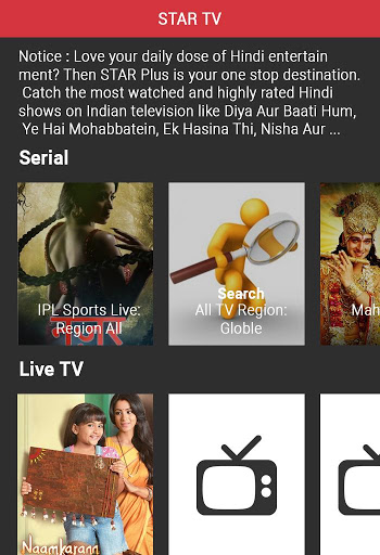 "Star Plus,Colors TV-Hotstar Live TV HD Guide" is guide app to give you some suggestion to use star plus tv serial india. We provide a tutorial, how to and step to use star plus tv channel app in hindi. star plus serial gives live tv show, serial, dramas and the latest updates, free streaming of videos and loads of video highlights. And now, whether you want to watch movies or serials in Indian TV using Star Plus online, you can be assured that it's best quality online channel. Watch your favorite TV shows and upcoming series. Star Plus is your answer to watch live TV, movies and your favorite TV series and lets you enjoy it and all times.