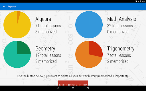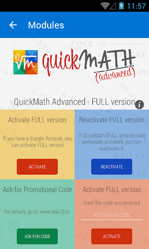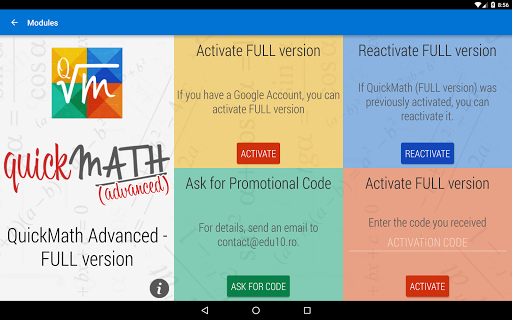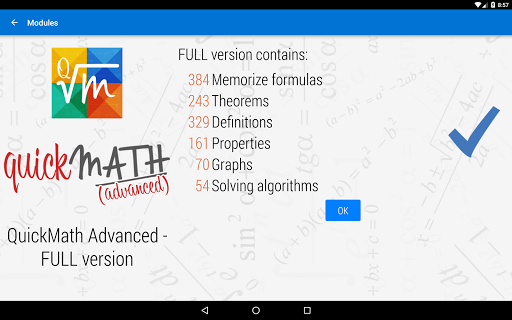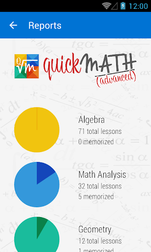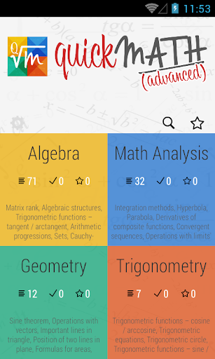 QuickMath is designed to students and teachers and offers the possibility to learn and memorize the most common Math formulas, theorems, definitions, and properties. Graphics, algorithms and examples complete the QuickMath offer. It can be downloaded and installed on any device. After download and install the lessons content need to be updated to the last version.