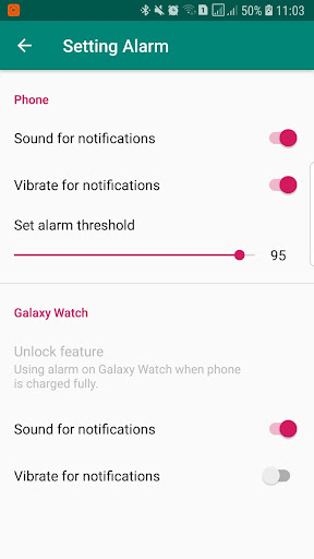 - Set alarm threshold for battery level is between 20 to 100 percent