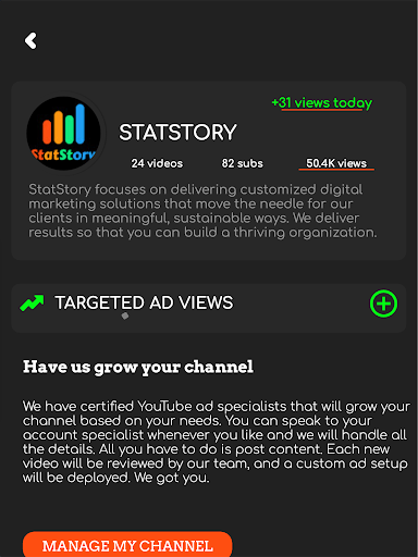 Managed Channels are the very best way to grow your entire channel. You will speak to your account manager, via message or phone call. After we understand your goals, all you have to do is post quality content. Your ads will be handled by a real human being, based in the USA, and certified.