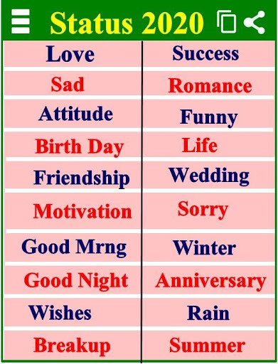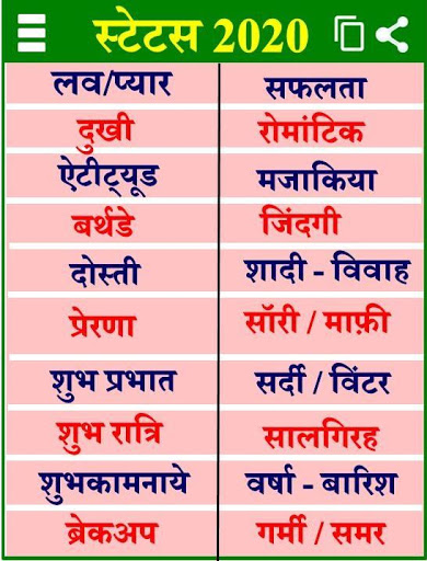 इस एप्प में आपको लेटेस्ट स्टेटस 2020 दिए गए है जिसमे आपको सभी प्रकार के लव ऐटिटूड स्टेटस जैसे - लव दोस्ती रोमांटिक और शायरी स्टेटस आदि दिए गए है. इस एप्प को आप ऑनलाइन के साथ ही ऑफलाइन भी इस्तेमाल कर सकते है.